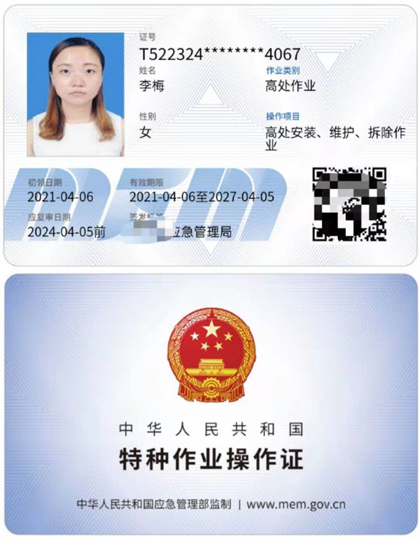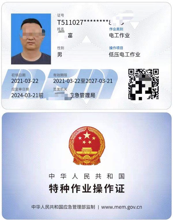 特種作業操作證:作業種類:電工(俗稱操作證、上崗證),分類: 高壓運行維護作業、高壓安裝修造作業、低壓電工作業、安裝、維修、發電、配電。新版中華人民共和國特種作業操作證樣本 ,復審為三年一審,
