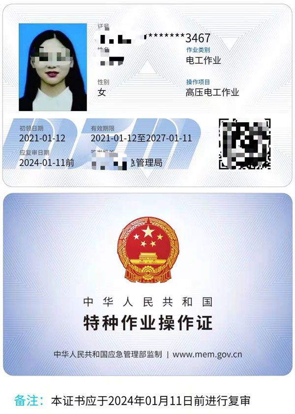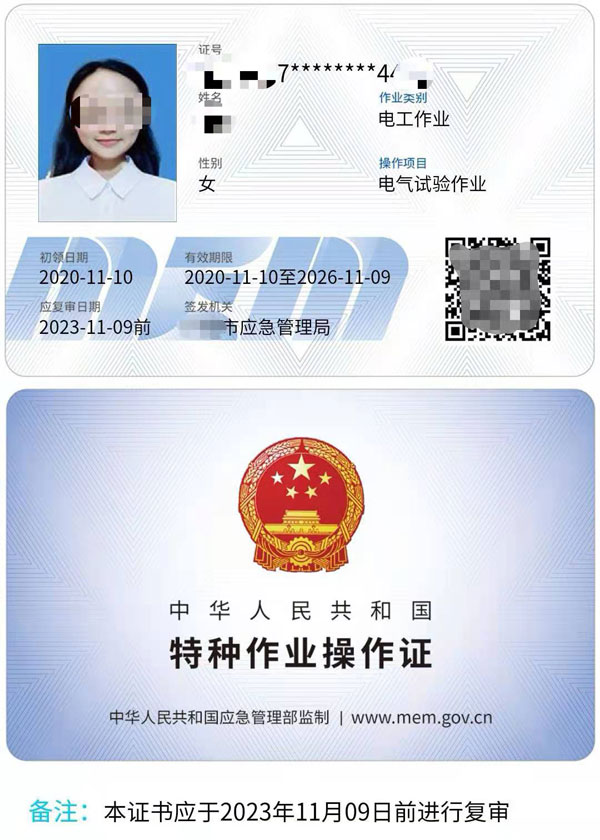 從2020年3月份起,高壓電工證書以新版的證書統一印制,分為電子證和實體證兩種類型,證書由相關部門頒發,有效期是6年,每3年復審一次。