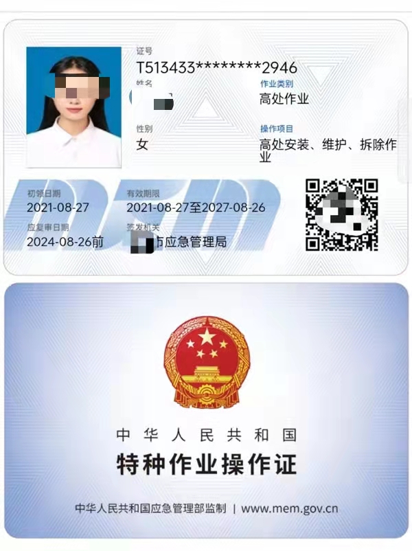 證書適用于利用專用設備進行建筑物內外裝飾、清潔、裝修,電力、電信等線路架設,高處管道架設,小型空調高處安裝、維修,各種設備設施與戶外廣告設施的安裝、檢修、維護以及在高處從事建筑物、設備設施拆除作業。