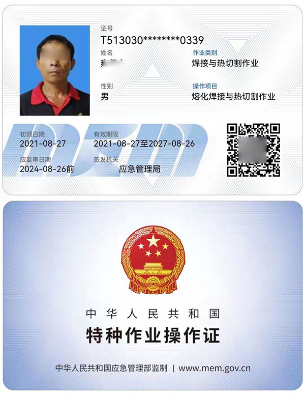 俗稱焊工操作證,焊工上崗證。也是大家去考的必要證件 由安全生產監督管理局即應急管理廳頒發,是類似于身份證的IC卡證件,全稱是融化焊接與熱切割作業。 這個證書主要是說明你有此工種的安全操作的知識和能力,證書有效期六年,每三年一審,復審時間前2-3個月申請復審即可。此證全國通用。